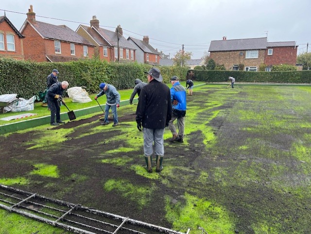 These are some of the volunteers who spread four Tonne of topsoil on our green as part of the efforts to generate and even better playing surface next season. We were ably supported Mary and Jackie with coffee and cake.